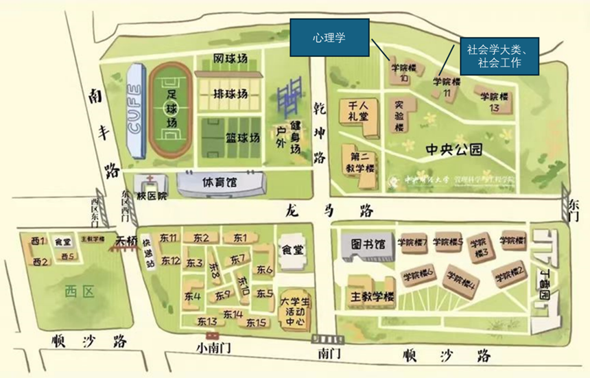 社会学大类、社会工作候考室:学院11号楼115房间。