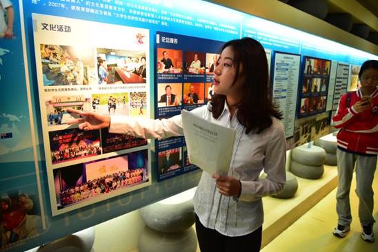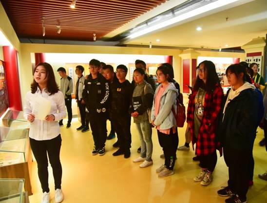 为我们讲解引路的是一位亲切的学姐,她带领社心学院的同学们有序参观了场馆,并进行了生动的讲解,帮助同学们更好地理解中财的辉煌历史、卓越优秀的中财人的高远追求。