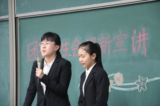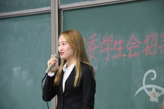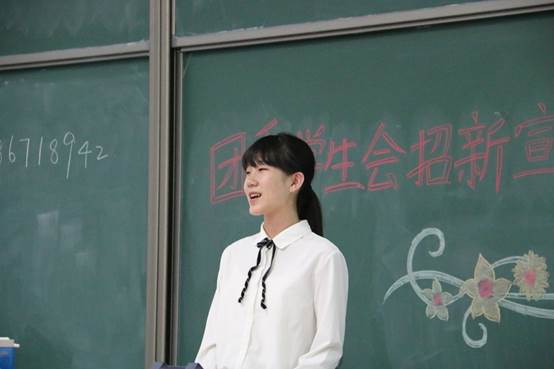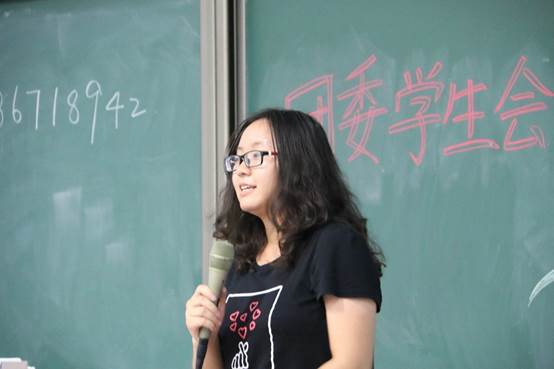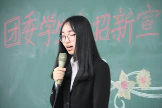 接下来进行宣讲的是学术实践部部长刘筱萌和副部长周怡。学术实践部作为一个严谨务实部门,管理着学院每年的寒暑假社会实践,并且定期举办找书大赛,成语大会等活动,两位部长热情洋溢的致辞深深地吸引大家。