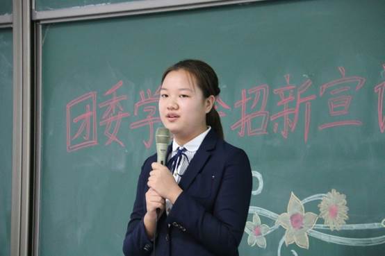 第二个上场的是办公室的部长崔雨芳,办公室的日常工作主要是负责团学各部门之间的联络,并举办一些大型的比赛如礼仪大赛、找书大赛、成语大会等等。此外,办公室的视频也让大家眼前一亮,赢得了大家的掌声。
