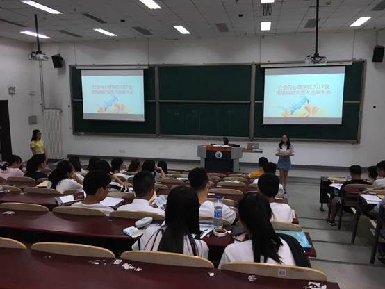 在会上,陈璇老师以幽默风趣的风格进行了自我介绍,在同学们填写档案学生证的时候,陈老师还一一进行了耐心指导。临近结束时,社心学院在陈老师的建议下通过了自我推荐的选举投票方式来进行选举临时负责人。经过比拼之后,社会一班的王昱冰,陈艺伟,社会二班的陈依婷,黄秋铭,心理班的楼紫茜,阚煜担任各个班级负责人。大会结束后同学们有序退场。