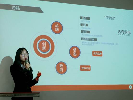 之后是洞庭之北队的介绍。他们的实践主题是“触摸宜昌传统文化,探寻文化发展模式”。宜昌拥有着灿烂的鄂西文化和巴楚文化,但随着经济发展,人们忽视了文化的传承,使得文化的传承机制出现问题,几千年的文化瑰宝逐步消逝。该小组通过调查步步升布鞋的生产流程和销售模式,提出稳固发展布鞋产品经济,推行高效率的销售管理模式的建议。通过本次活动,组员们不禁感慨“如果情怀仍存,文化不死,与经济共生”。