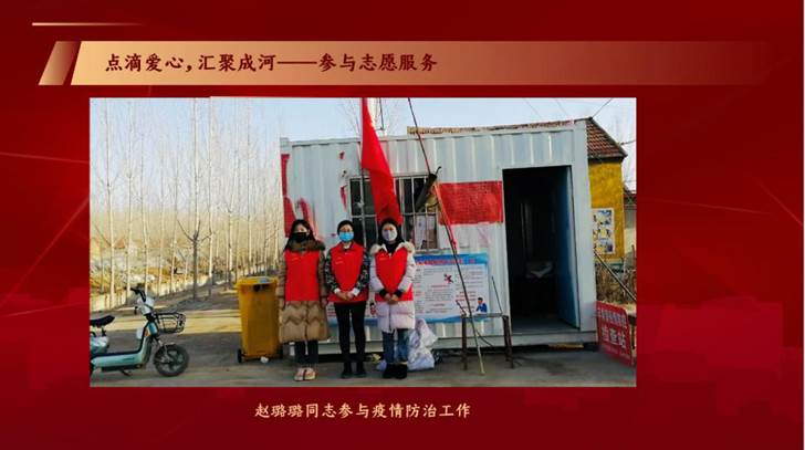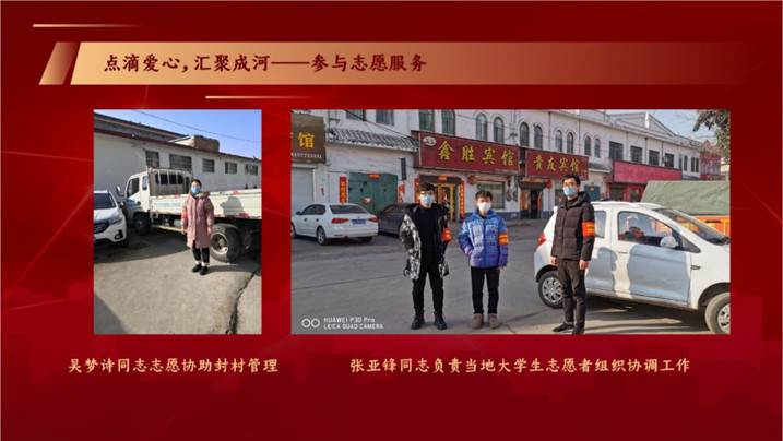同时,支部鼓励党支部全体学生党员在条件允许,保证自身安全的前提之下,可以自愿参与自己家乡所在社区的各种抗击疫情的志愿活动。支部成员们积极响应党组织的号召,多名党员参与到了社区防疫的第一线,进行路口卡点值守、测量体温、防疫知识宣传等工作,用实际行动诠释了一名共产党员的责任和担当。