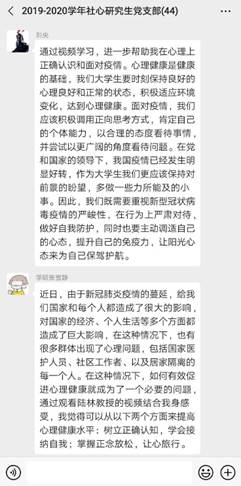 在党支部书记吴梦诗同志的组织之下,tyc7111cc太阳成集团研究生党支部全体党员充分利用学习强国等媒体平台,自行学习《新冠肺炎疫情下大学生心理健康的促进》,并鼓励每位学生党员记录自己的学习心得感悟与大家进行分享,从而使每位党员都能树立健康的生活理念,端正心态,避免陷入不必要的恐慌,并将此向身边群众进行宣传,积极引导身边群众正确认识和对待疫情,做好群众稳控工作和思想工作。每位党员同志积极在微信群与大家分享自己的学习心得体会。吴楠同志写到“我们要积极调整生活方式,合理安排休息和锻炼时间,增强自身素质,排解负面情绪;同时我们也要多关注身边人的心理状态,积极帮助他人解决困扰或寻求正规心理疏导渠道。”亚然同志认为“在有条件的情况下,我们每一位党员更应积极参加志原服务活动,帮助身边有需要的人解决心理问题,为贏得疫情攻坚战的胜利,做出自己的一份贡献。”于长江同志认为“我们应该树立起心理健康的重要意识,及时了解自身的情况,及时作出调整,当人民群众需要解决问题时,应及时、积极主动的帮助别人梳理心理健康问题。”吴梦诗同志总结发言:“观看《新冠肺炎疫情下大学生心理健康的促进》,让身为学生党员的我们受益匪浅,希望各位党员在塑造自我心理健康的同时,可以发挥专业优势和党员的模范先锋作用,帮助身边的人,积极宣传防疫心理健康理论知识。”