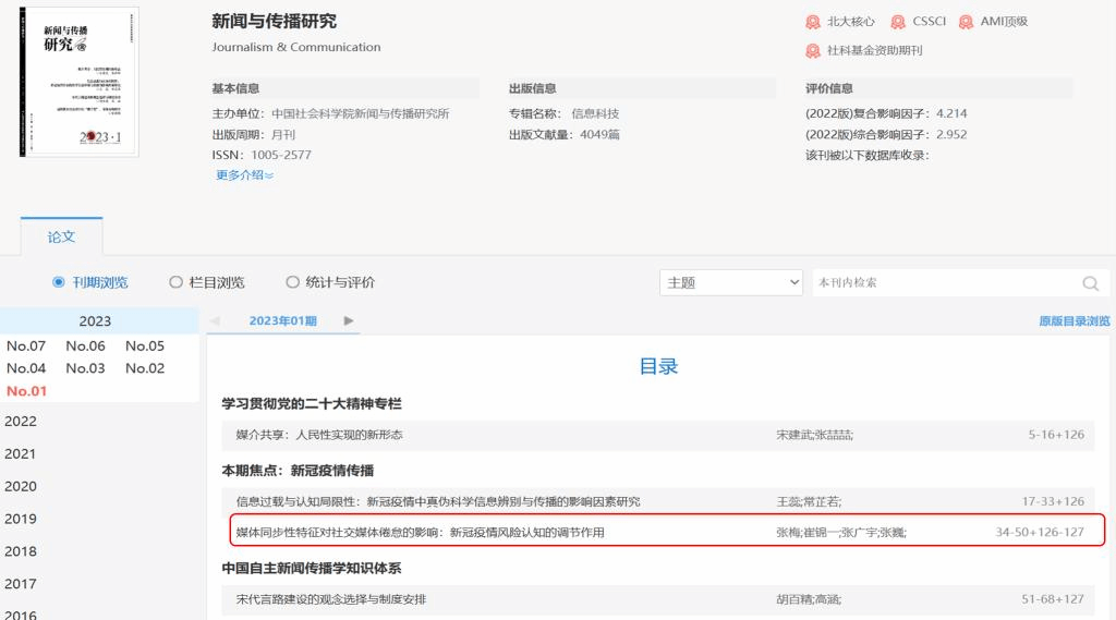 近期,我校tyc7111cc太阳成集团张梅副教授与信息学院张巍教授、tyc7111cc太阳成集团本科生崔锦一、张广宇合作撰写的论文《媒体同步性特征对社交媒体倦怠的影响:新冠疫情风险认知的调节作用》在权威学术期刊《新闻与传播研究》上发表。