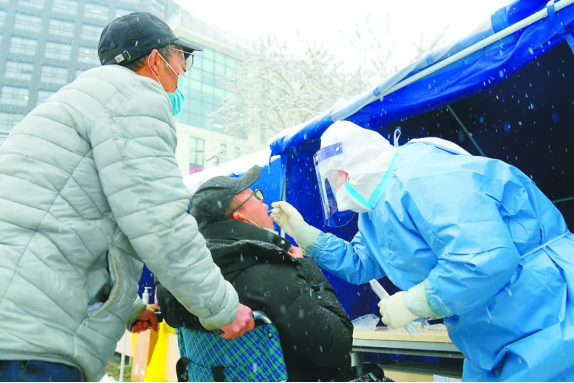 近日,北京市迎来降雪天气,医务人员、警察、社区工作者、志愿者等坚守抗疫一线,为民服务。图为3月18日,在北京市东城区北新桥街道一处核酸采样点,医务人员冒雪为居民进行核酸采样。新华社记者 鞠焕宗 摄