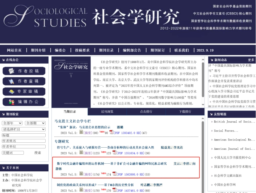 近期,我院艾云副教授,与上海大学2022级博士研究生(我校社会学系2022级硕士毕业生)李祥、中国社会科学院社会学研究所向静林副研究员合作撰写的论文《数字时代金融诈骗组织的运作机制——基于非矿公司金融诈骗的网络民族志研究》发表于《社会学研究》2023年第5期。